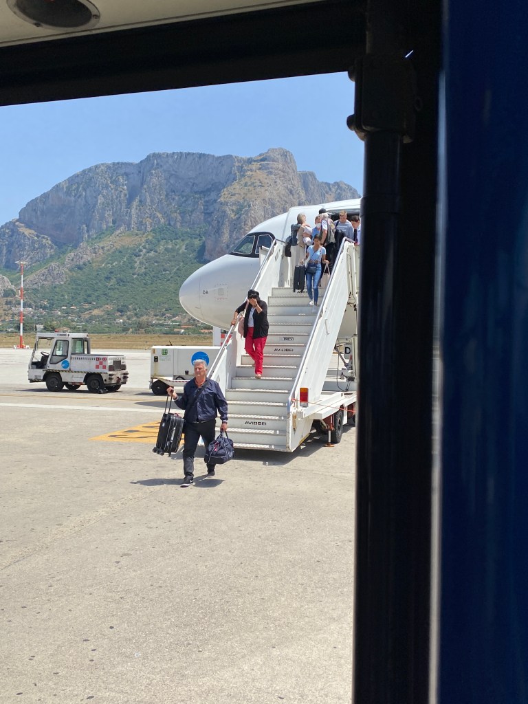 We exit the plane on the tarmac in the open air that smells of plane fuel, orange blossoms, and sea. Behind us looms a huge rock face, Monte Pecoraro, in front of us, the clear waters of the Mediterranean. The Falcone/Borsellino airport is named for 2 judges who bravely stood against mafia corruption and were martyred for the cause. Our driver Giorgio is good humored as he navigates the traffic, which is mind-boggling even by Los Angeles standards. He deposits us a few blocks from our hotel. The streets are too narrow for his van, so he directs us to walk 2 blocks down and to our right (a destra) into a tiny narrow alleyway. Fumbling with our bags tourist style, the alley is picturesque and replete with playing children, women sitting outside on their stoops, laundry hanging from balconies, assorted plants, cats, and dogs, sounds of scooters and jovial conversation. We arrive at B&B Casa Busari where the lovely Germana opens the door with smiles, inviting us in to a cool glass of water, a vast Palermo map with tiny print, It is our first real chance to practice our Italian, and Germana indulges us even though her English is excellent.